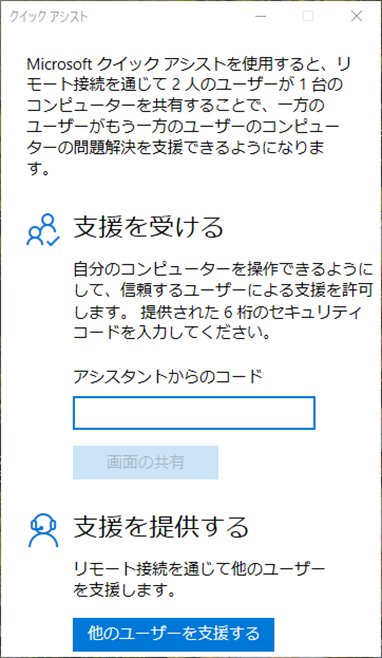 しばらく待つと、「クイックアシスト」の最初の画面が表示されます この時点でご連絡ください 「支援を受ける」の「アシスタントからのコード」下の枠内に入力する数字6桁をお伝えします |