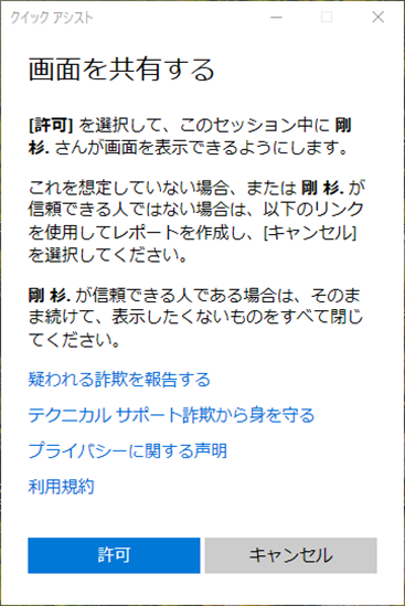 しばらく後、「画面を共有する」ための許可を求めてきます。 「許可」をクリックします |